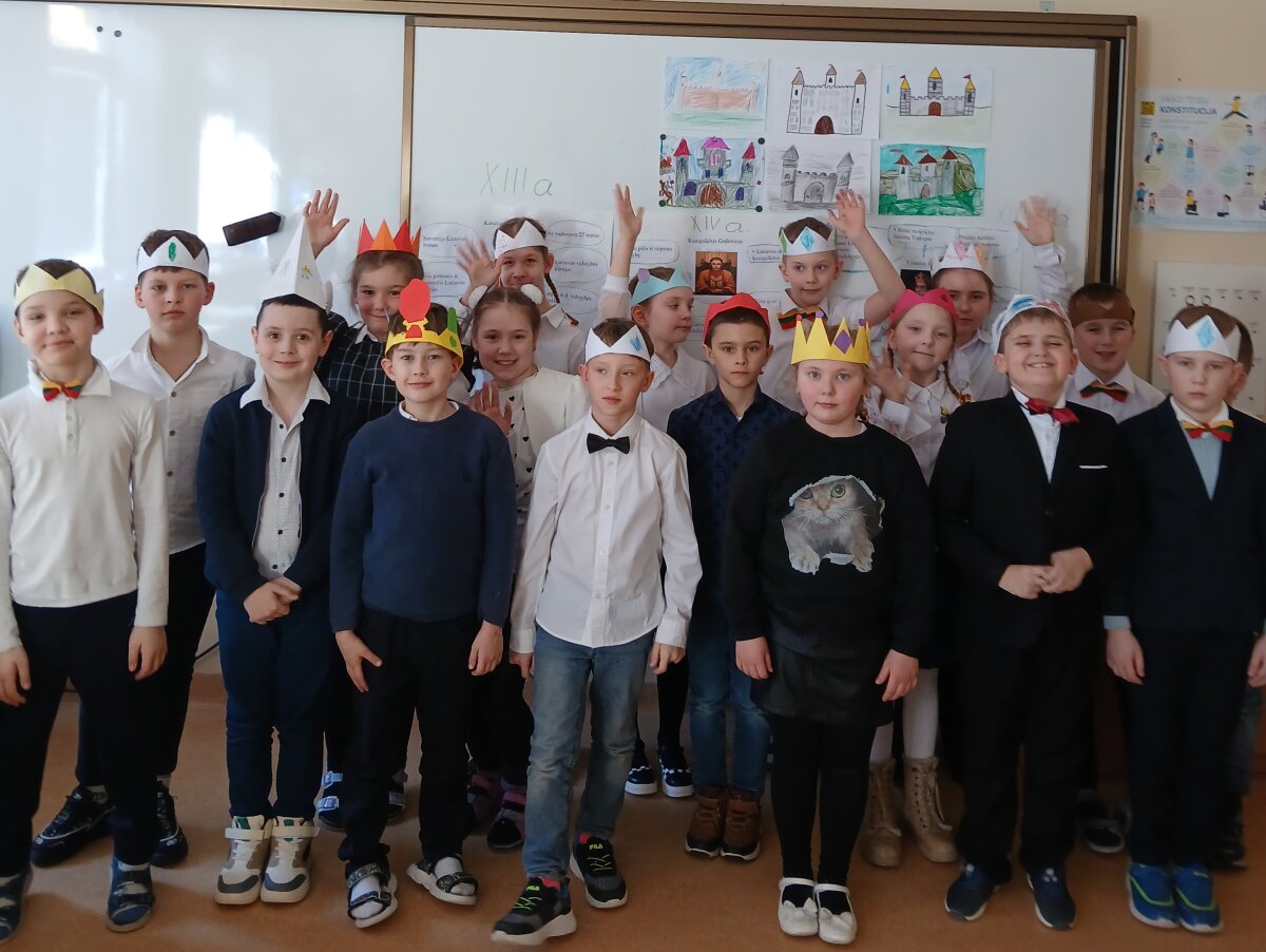 Kūrybinėje veikloje mokiniai lankstė karūnas. Pasipuošę jomis pažadėjo, kad jei patys būtų valdovai, valdytų Lietuvą teisingai ir stiprintų savo valstybę.