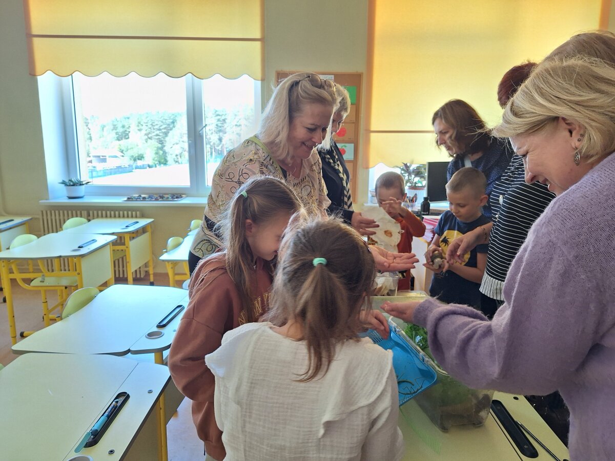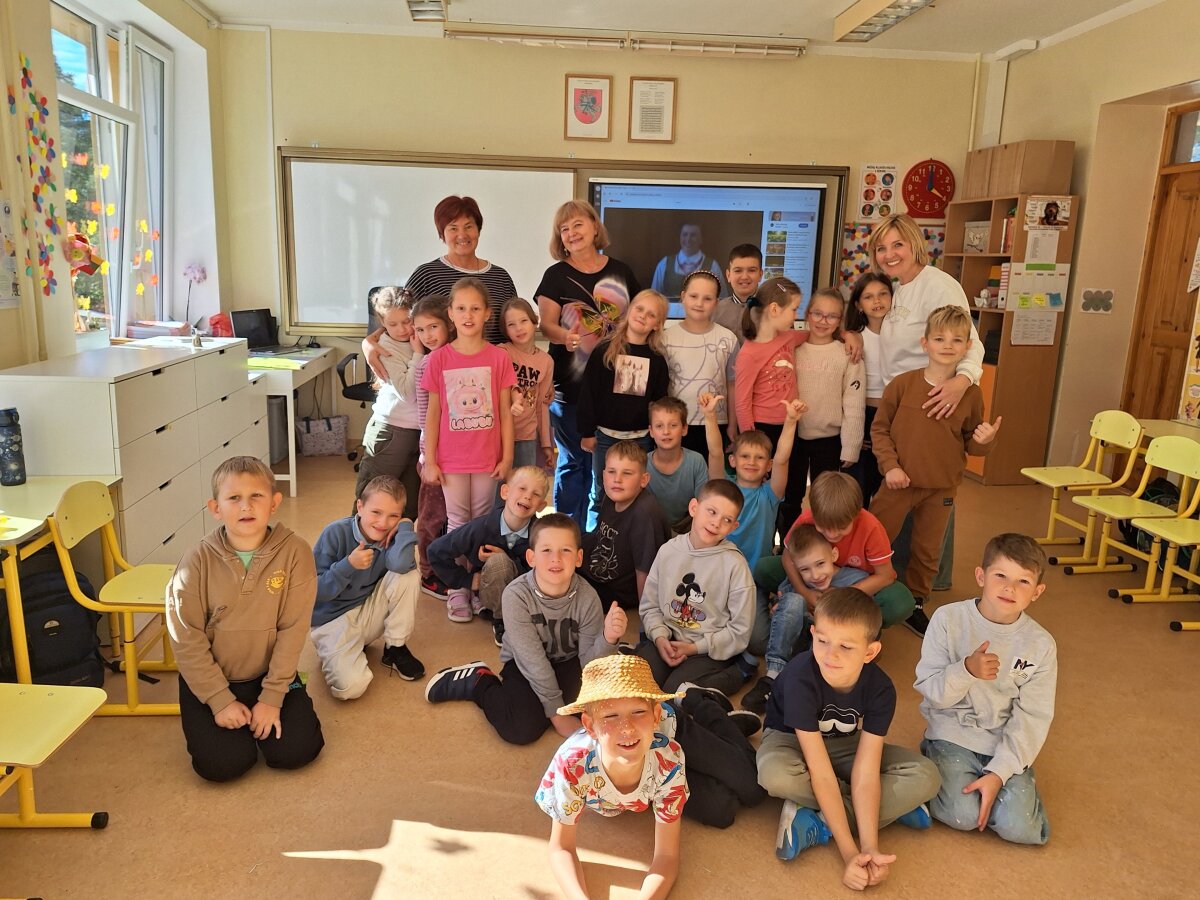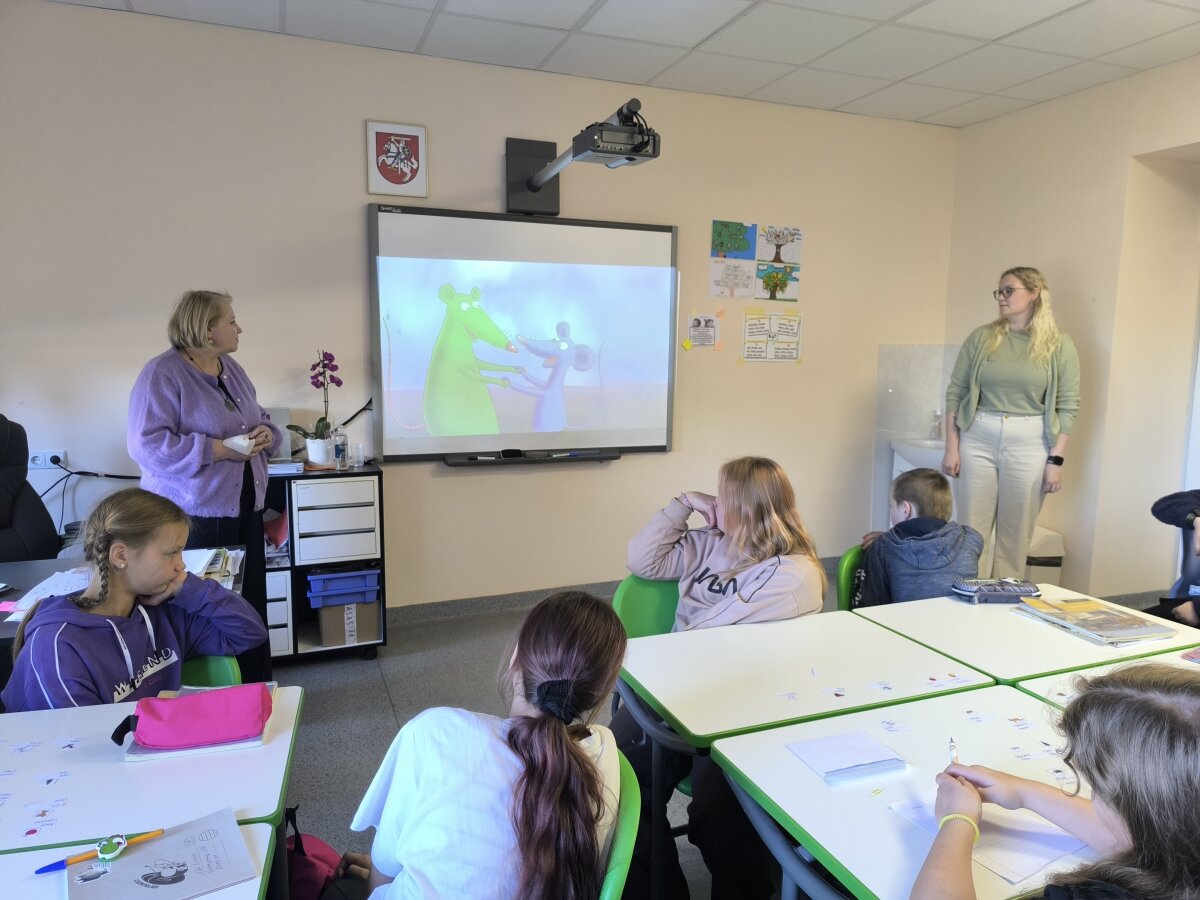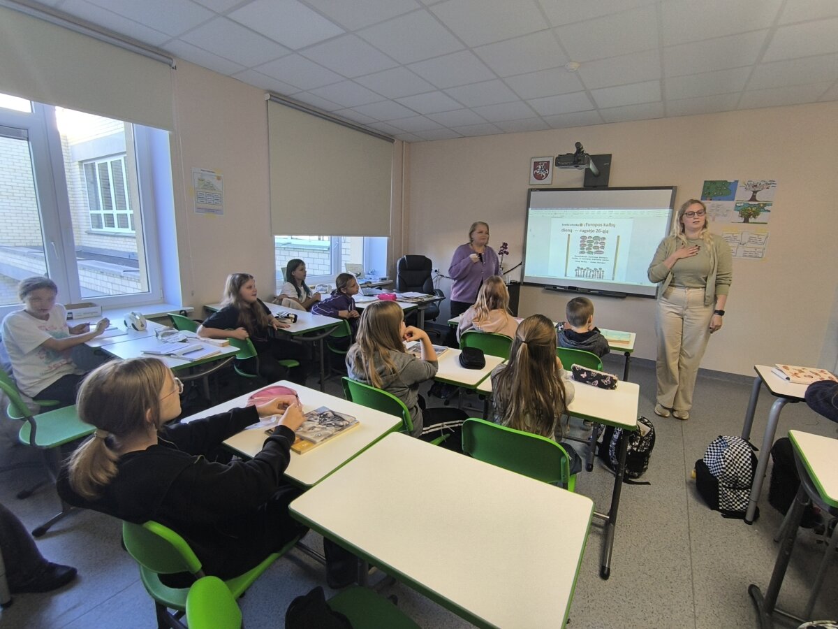 Mūsų viešnios iš Kraslavos irgi sėdo į suolus ir stropiai sekė mokytojos Vaivos lietuvių kalbos pamoką. Joms puikiai sekėsi lietuviškai skaityti ir skaičiuoti, o pamokos hitu tapo visiems gerai žinomi ,,Du gaideliai”.