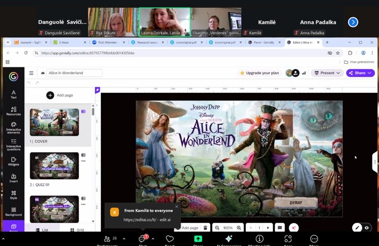 Latvijos ir Lietuvos mokytojai dalijosi savo patirtimi, naudojantis įvairiomis mokymo platformomis bei kitais interneto resursais. Mūsų gimnazijos pradinių klasių mokytoja Danguolė Savičienė bei matematikė Jelena Lapina iš Kraslavos pristatė, kiek daug dėmesio yra skiriama draugiškam internetui. Buvo įdomu palyginti abiejose gimnazijose naudojamas priemones. Saugaus interneto svarbą pabrėžė ir mokytoja Jūratė Šoliūnaitė Pavilionienė. Latvių pedagoges sudomino kolegės Jūratės patirtis, organizuojant pamokas su „Minecraft“. Matematikė iš Kraslavos gimnazijos Ligita Pelnika pademonstravo, kaip taiko nearpod.com bei LearningApps.com platformas. Mūsų gimnazijos jaunosios anglistės Kamilė Gabrilaitė ir Ana Padalka pristatė EditAI teikiamas galimybes, o jų kolegė latvė Lasma Dzirkale papasakojo apie nearpod bei Jumanlly naudojimą anglų kalbos pamokose. Apie prezentacijų rengimą užsienio kalbų pamokoms kalbėjo ir anglų kalbos mokytoja Anita Mateja. Kraslavos gimnazijos informatikos mokytoja Olga Liepinia pademonstravo nemokamą programą, skirtą matematikos, programavimo ir statistikos mokymui.