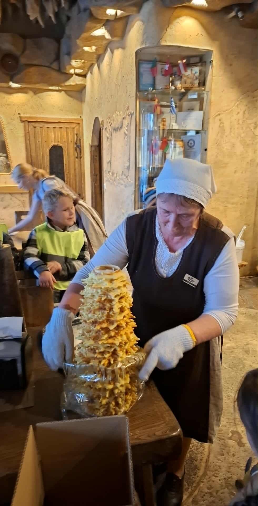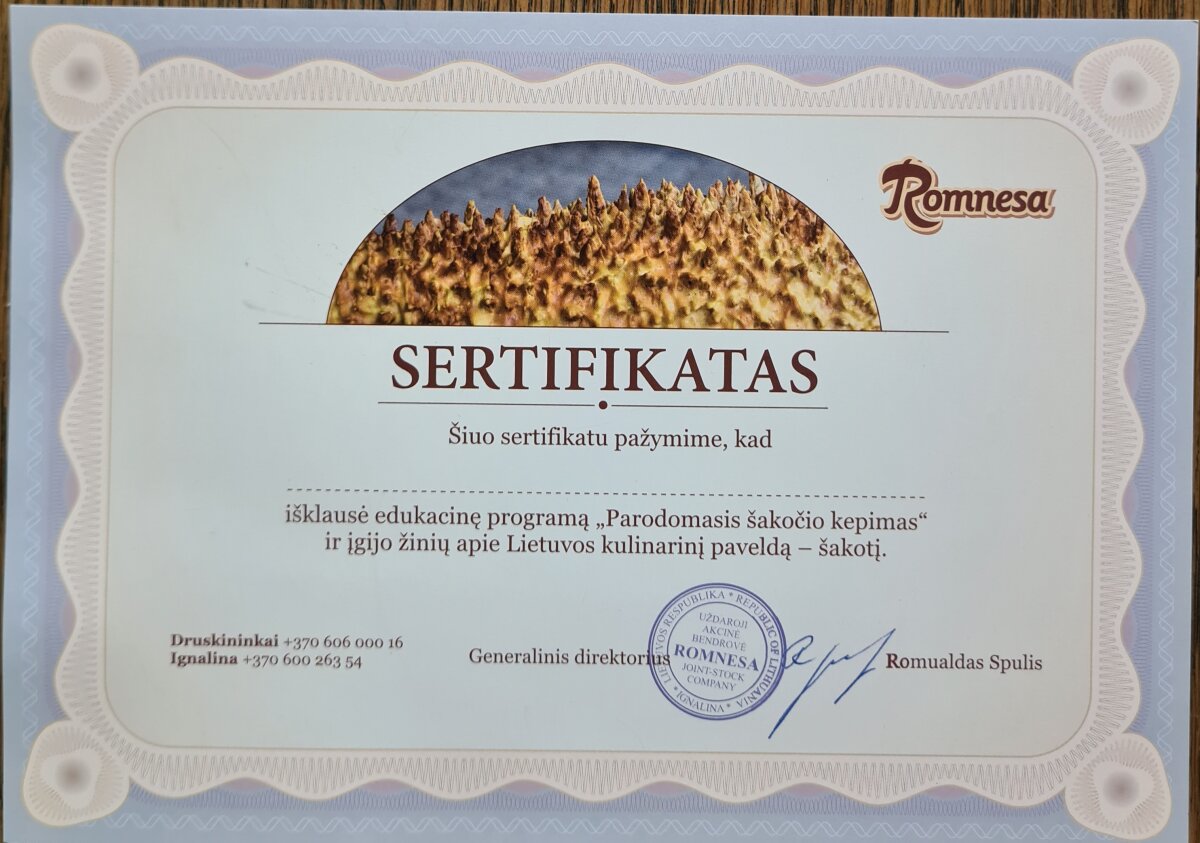 Dėkojame UAB ,,Romnesa" kepyklai už pirmokams padovanotą kartu keptą šakotį ir sertifikatą, patvirtinantį įgijus žinių apie Lietuvos kultūrinio paveldą – šakotį.
