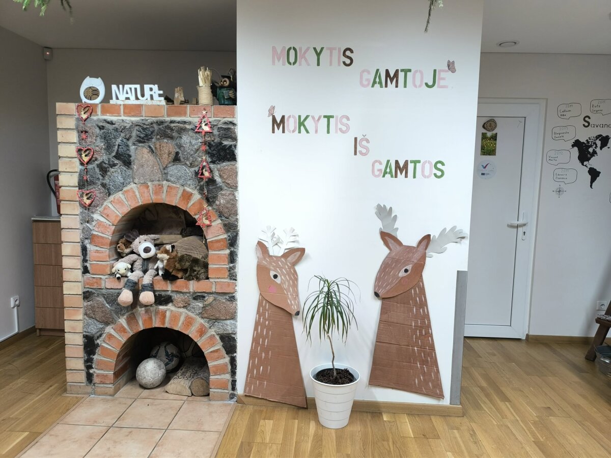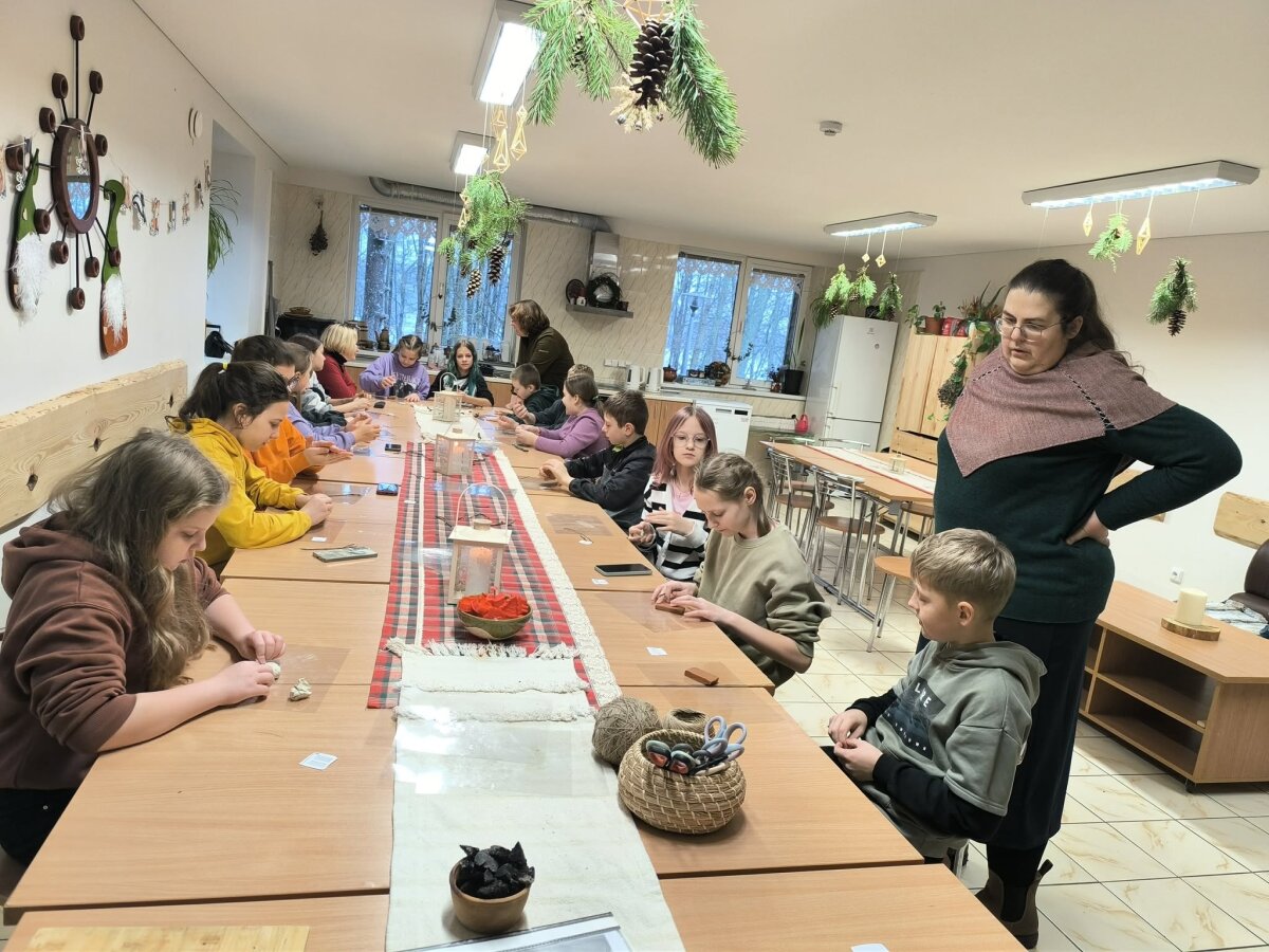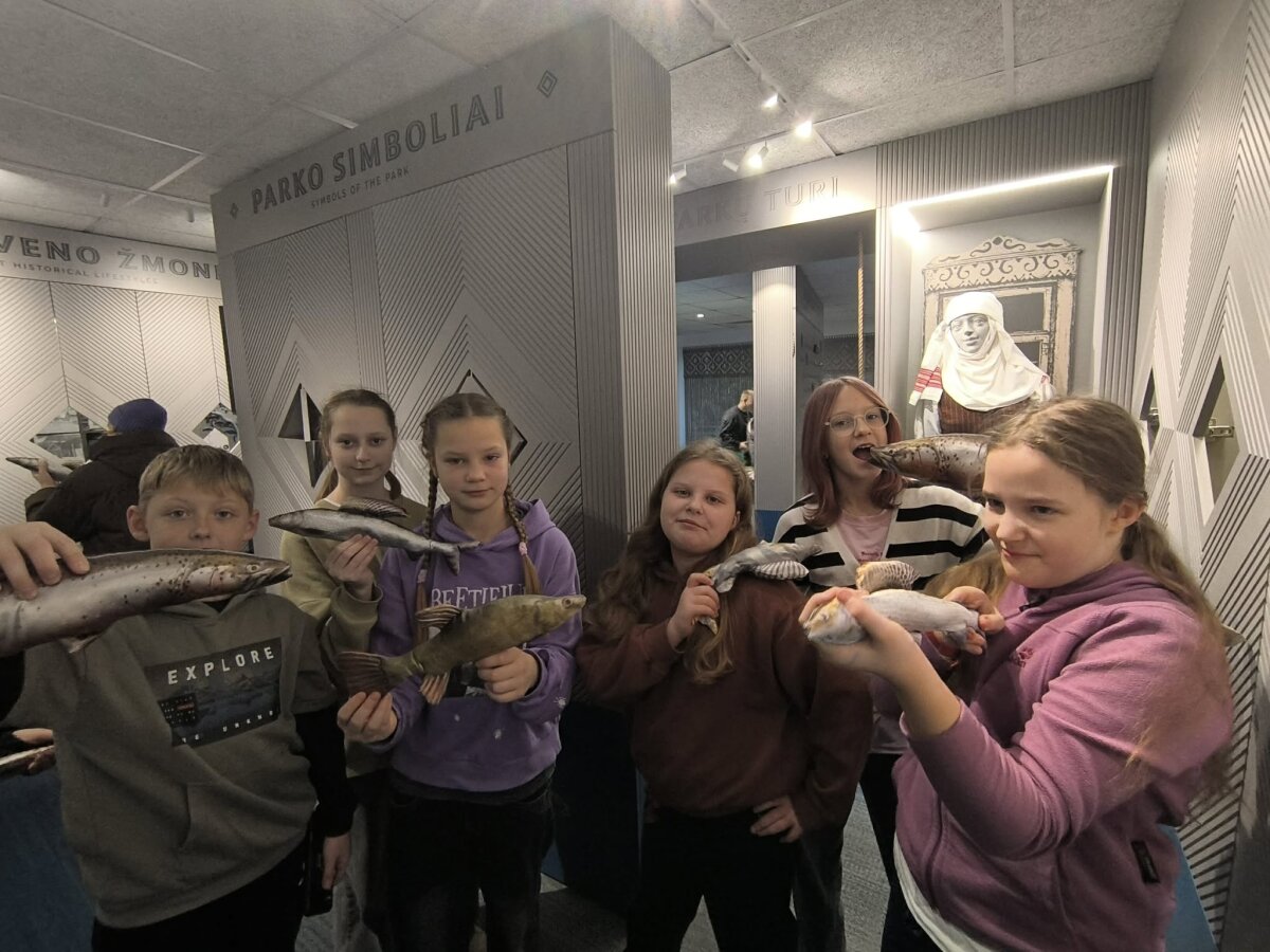 Aukštaitijos nacionalinio parko Meironių Gamtos mokykloje patys pasigaminome senaisiais ornamentais puoštą suvenyrą, atsakėme į edukatorės klausimus. Sušilome darganotu oru svetingų šeimininkų pasiūta arbatėle, papietavome.